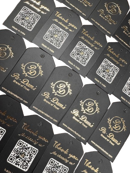 Padams Hang Tag is a uniquely designed die-cut garment hang tag created to give apparel branding a distinctive and premium look. Finished with elegant golden foiling, this tag adds a touch of luxury and instantly enhances product appeal. The compact 1.5 × 2 inches size makes it perfect for subtle yet impactful branding without overpowering the garment. Its precise die-cut shape and neat finishing reflect quality craftsmanship, making it ideal for fashion and designer wear. This hang tag is a great choice for brands looking to stand out with a refined and eye-catching presentation.