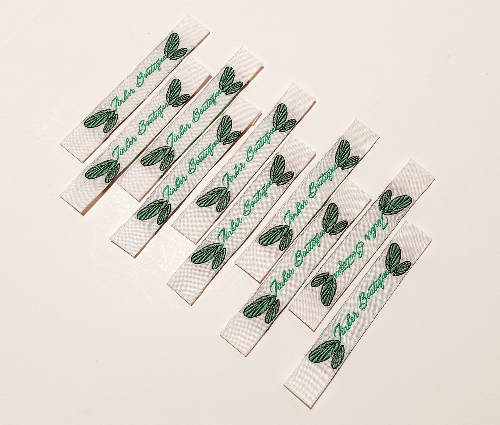 High-quality woven cut fold labels crafted on a white background with green woven details. Precise weaving delivers a crisp finish, while the cut fold style keeps the label balanced and easy to attach. Designed for a clean, refined look in garment neck or side branding.
