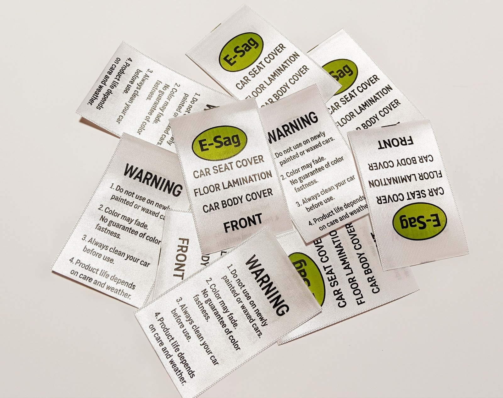 This printed wash care label displays the brand name along with clear warning and care information. It is made for single-side use and finished with heat-cut edges to avoid fraying. The flat design allows easy stitching inside garments while keeping the details readable and organized.