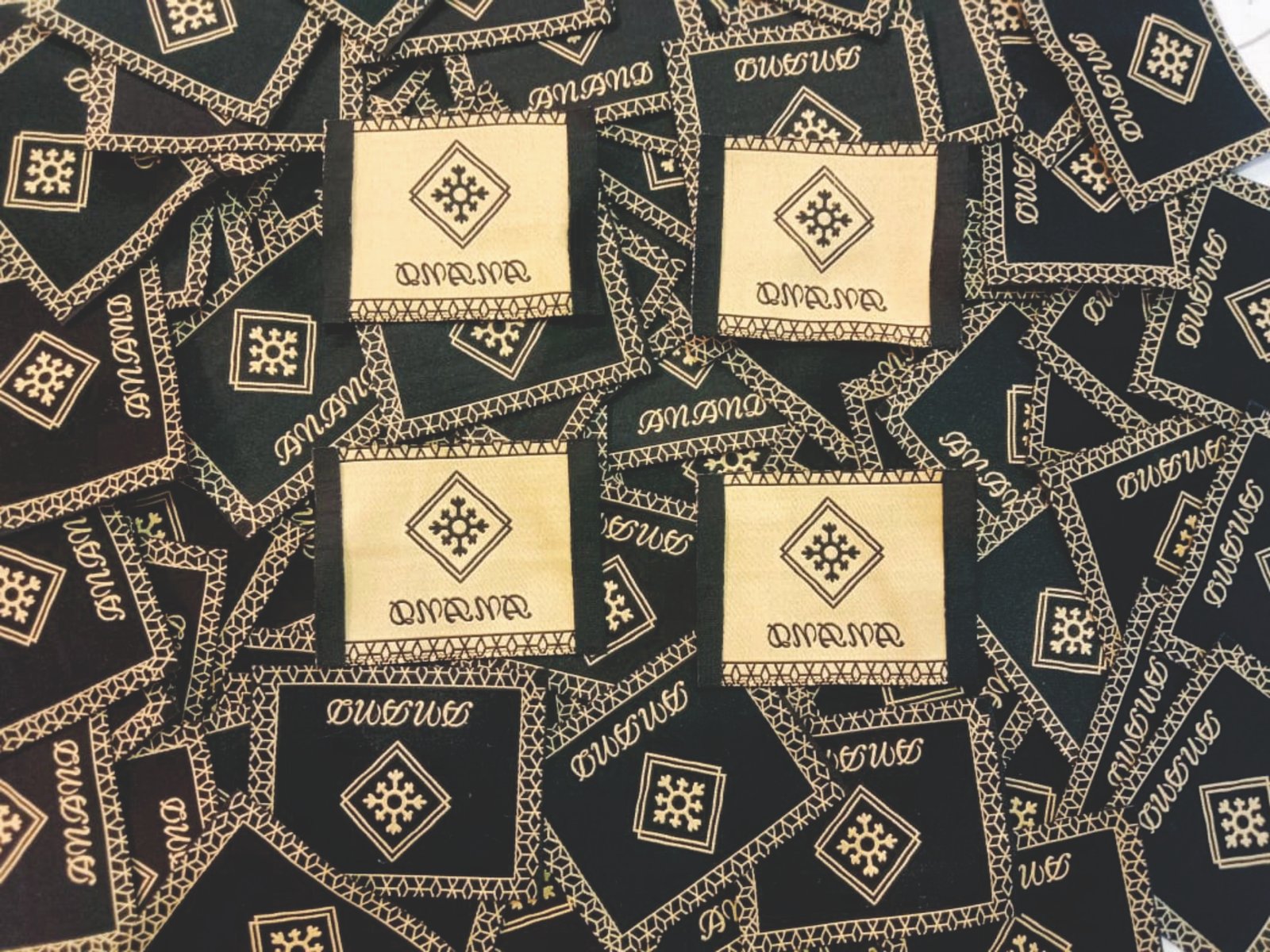 Cut fold woven labels designed in a square format with a bold border and highlighted centre logo that stands out clearly on garments. The structured fold keeps the label firm while the detailed weaving gives a sharp and balanced finish, making it look clean and well-defined inside clothing.