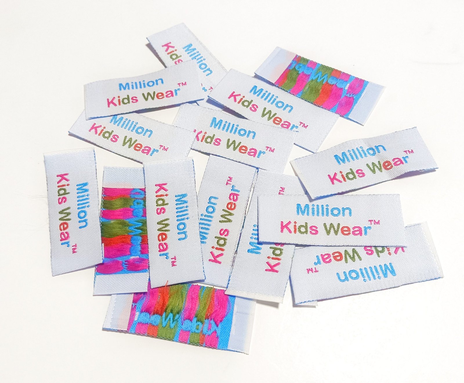 Cut fold woven labels crafted in multiple colours, featuring the brand name New Apparel with sharp and vibrant detailing. Strong weaving quality and neatly folded edges give a bold, eye-catching finish perfect for garment branding.