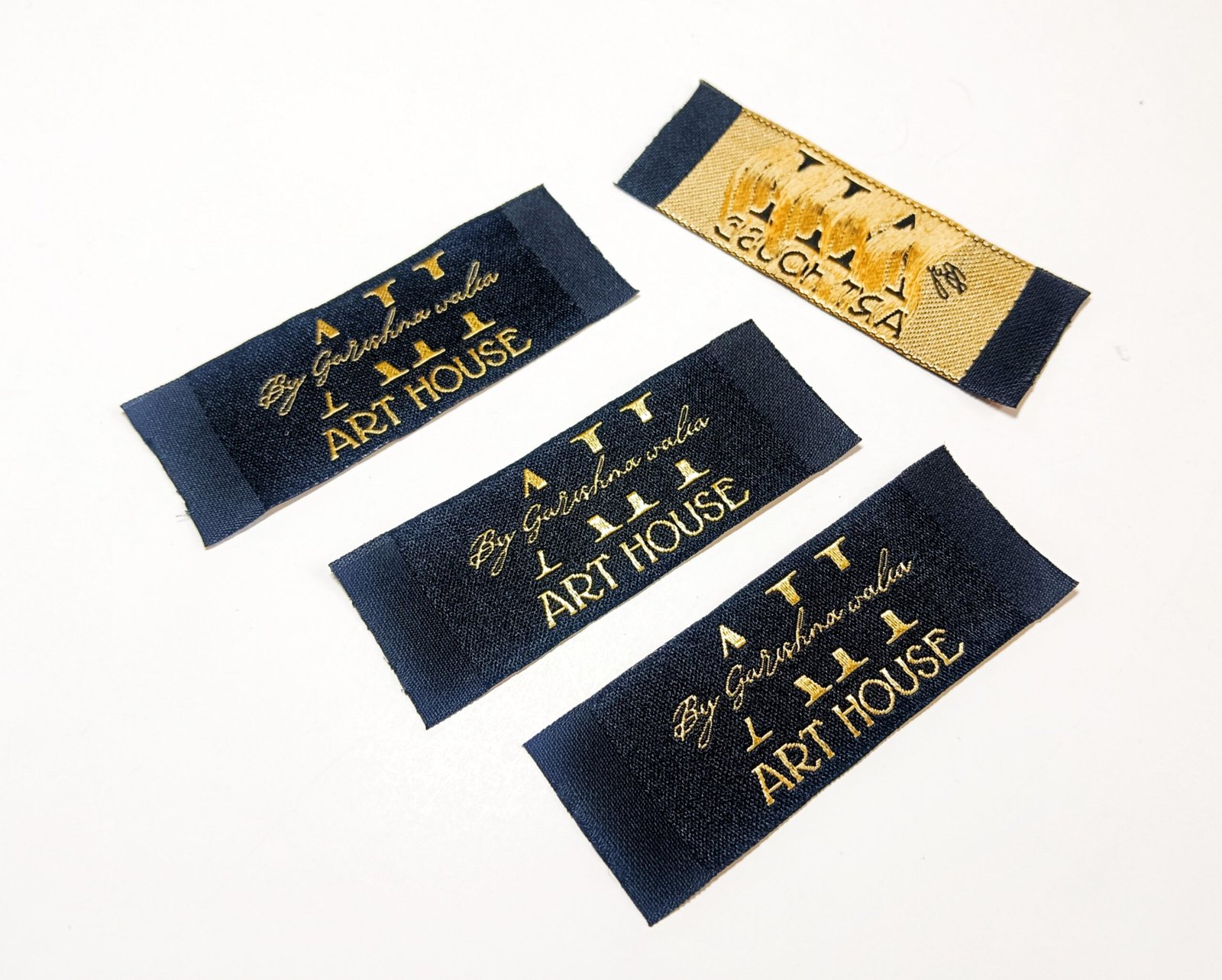 identity to garments with its clean black base and elegant golden shining finish. The heat cut edges give a smooth and neat shape, making stitching easy and comfortable. Shirt woven label is woven with fine detailing so logos stay sharp, stylish, and long-lasting on shirts.