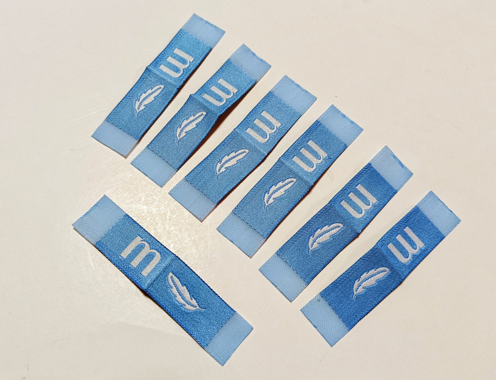 Woven centre fold size labels crafted with a beautifully detailed feather design that adds a soft and stylish touch to garments. The smooth colour combination enhances the overall appearance, while the fine weaving keeps the artwork sharp and well-defined. Centre fold structure allows the label to sit neatly inside clothing with a refined finish.
